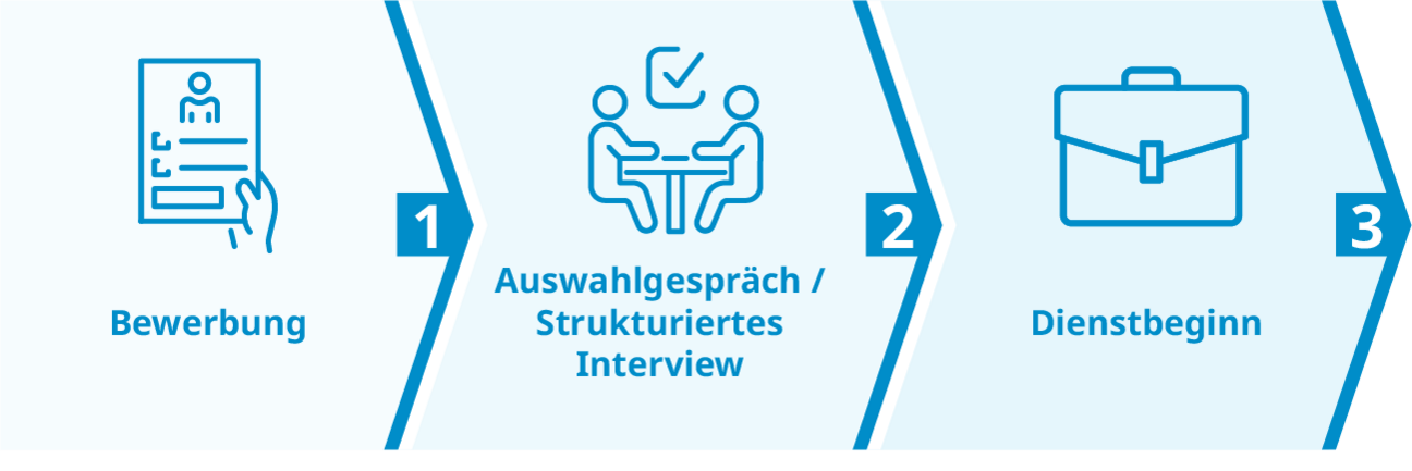 Im Anschluss werden Sie von der einstellenden Behörde zu einem Vorstellungsgespräch oder einem strukturierten Interview eingeladen. Nutzen Sie die Chance, sich persönlich vorzustellen und Ihre Fähigkeiten zu präsentieren! Das Gespräch bietet die Gelegenheit, Ihre beruflichen Erfahrungen und Ziele zu teilen und mehr über Ihre künftige Arbeit zu erfahren. Vorbehaltlich bestimmter Besonderheiten in den einzelnen Einsatzbereichen (s. u.) könnte Ihr Bewerbungs- und Einstellungsprozess dann so aussehen: