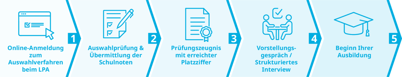 Das Auswahlverfahren des LPA wird zentral bei den meisten Berufen im nichttechnischen Bereich der öffentlichen Verwaltung und der Justiz (Einstieg zweite Qualifikationsebene, früher mittlerer Dienst) durchgeführt. Die Anmeldung erfolgt unter lpa.bayern.de. Kaufmännische Lehrberufe, Fachausbildungen wie die zum Gerichtsvollzieher (erfordern bereits eine abgeschlossene Ausbildung) oder die Ausbildung im Justizwachtmeisterdienst gehören nicht hierzu. Näheres finden Sie im jeweiligen Ausbildungsprofil.